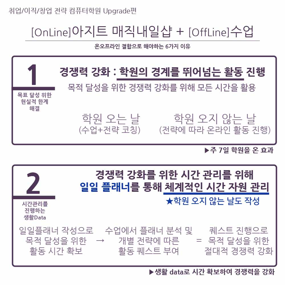 "다른 학원 시간과 학교 활동으로 컴퓨터학원을 자주 오기에는 시간과 거리 조정이 어렵네요.."